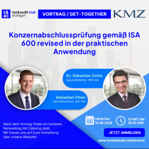 Dr. Sebastian Zerbe (Geschäftsführer, WP/StB) und Sebastian Otten (Geschäftsführer, WP/StB) von KMZ geben spannende Einblicke in die Konzernabschlusspraxis und zeigen auf, wie die neuen Standards im Prüfungsalltag gelebt werden können – von der Planung über die Kommunikation bis hin zur Dokumentation