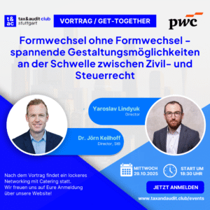 Dr. Jörn Keilhoff (Director, StB) und Yaroslav Lindyuk (Director) von PwC geben fundierte Einblicke in aktuelle Gestaltungsansätze an der Schnittstelle von Gesellschafts- und Steuerrecht. Freut euch auf praxisnahe Fallbeispiele und konkrete Einblicke in die aktuellen Gestaltungsmöglichkeiten im Unternehmensalltag.